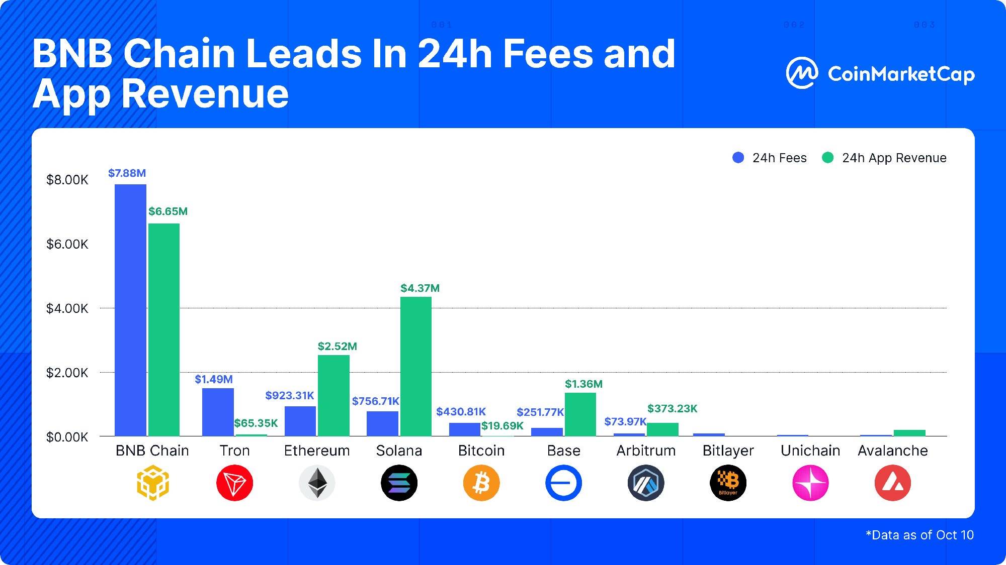 深潮 TechFlow 消息,10 月 10 日,据CoinMarketCap数据显示,BNB Chain在过去24小时内以788万美元的手续费和665万美元的应用收入位居榜首。其他主要区块链表现依次为:Solana(应用收入437万美元)、Ethereum(应用收入252万美元)和Tron(手续费收入149万美元)。
