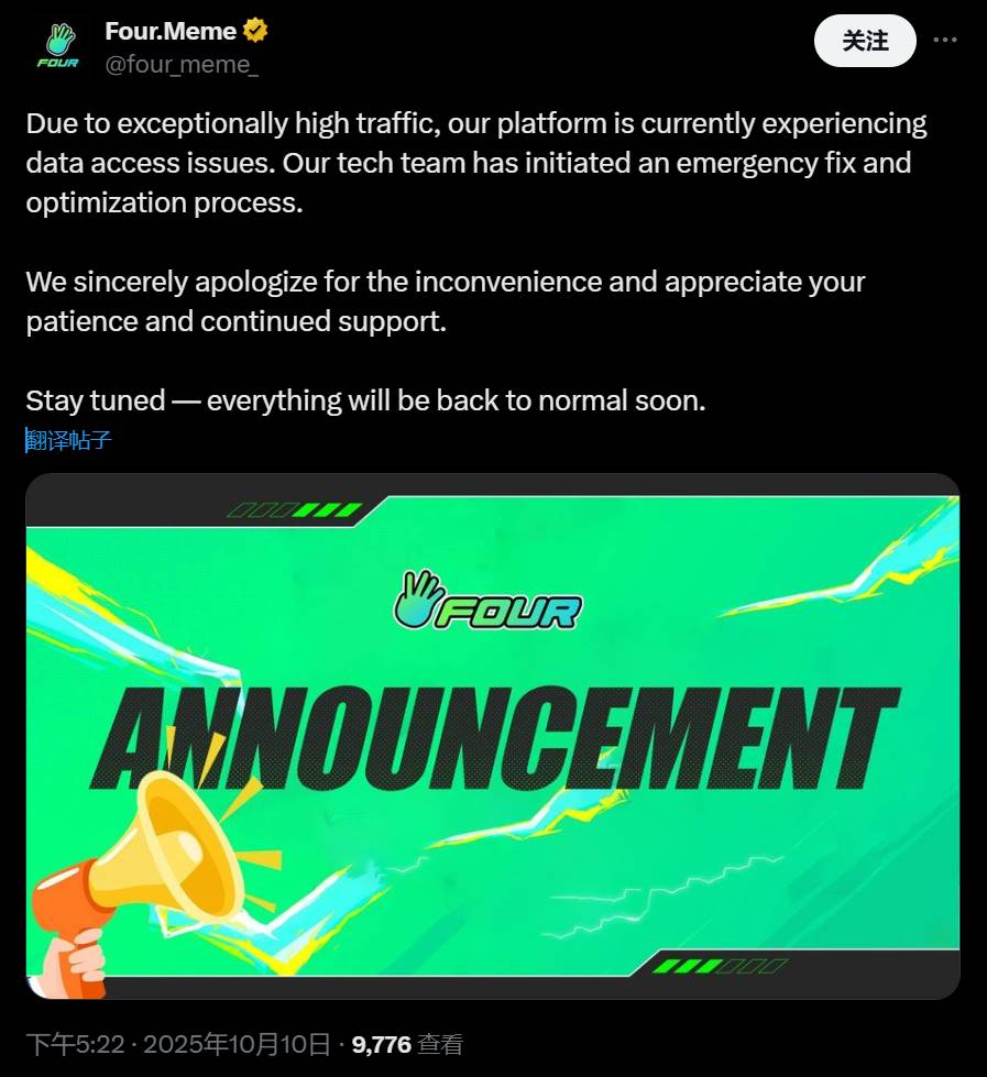 深潮 TechFlow 消息,10 月 10 日,Four.meme 官方在社交媒体上发文表示,由于平台流量异常高,目前遇到了数据访问问题。技术团队已启动紧急修复和优化流程。