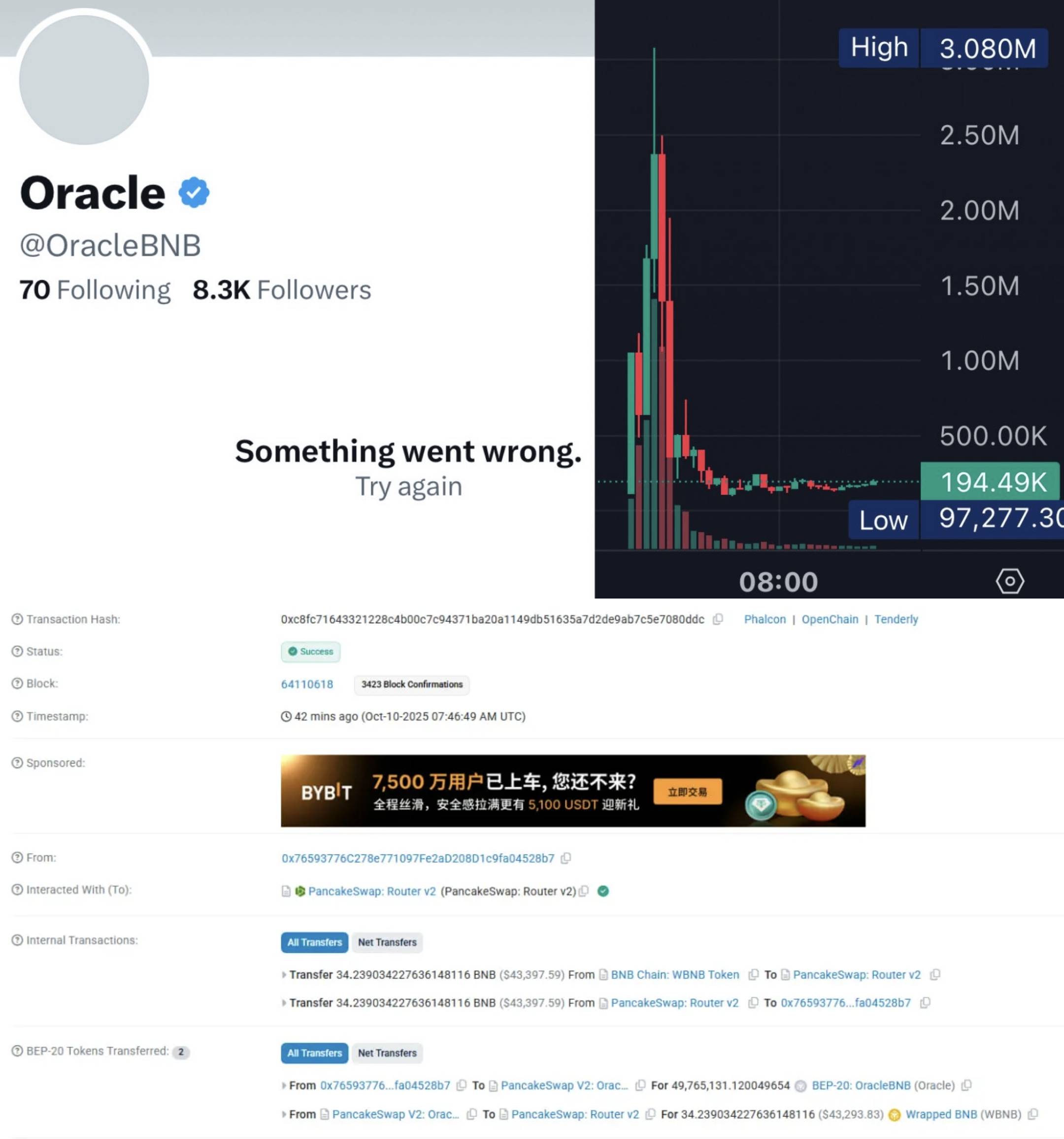 据悉,一个获得多位知名加密 KOL 关注的推特账号突然更名为 @OracleBNB,声称从事 BNB 预测市场业务,并虚假宣传与 Four.meme 合作。该账号随后发行代币 $OracleBNB,将市值推高至 300 多万美元后立即实施拉盘出货,从市场卷走 34 枚 BNB(约合 43000 美元),整个过程仅耗时 11 分钟。