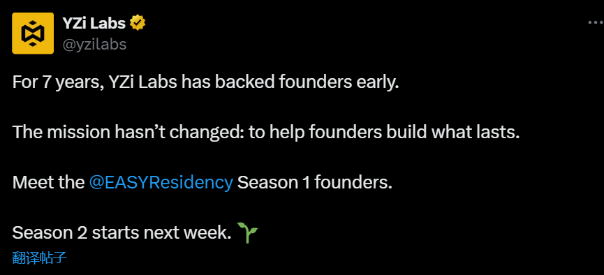 深潮 TechFlow 消息,10 月 10 日,YZi Labs 在 X 平台发文宣布,EASY Residency 全球孵化第二季将于下周开启。