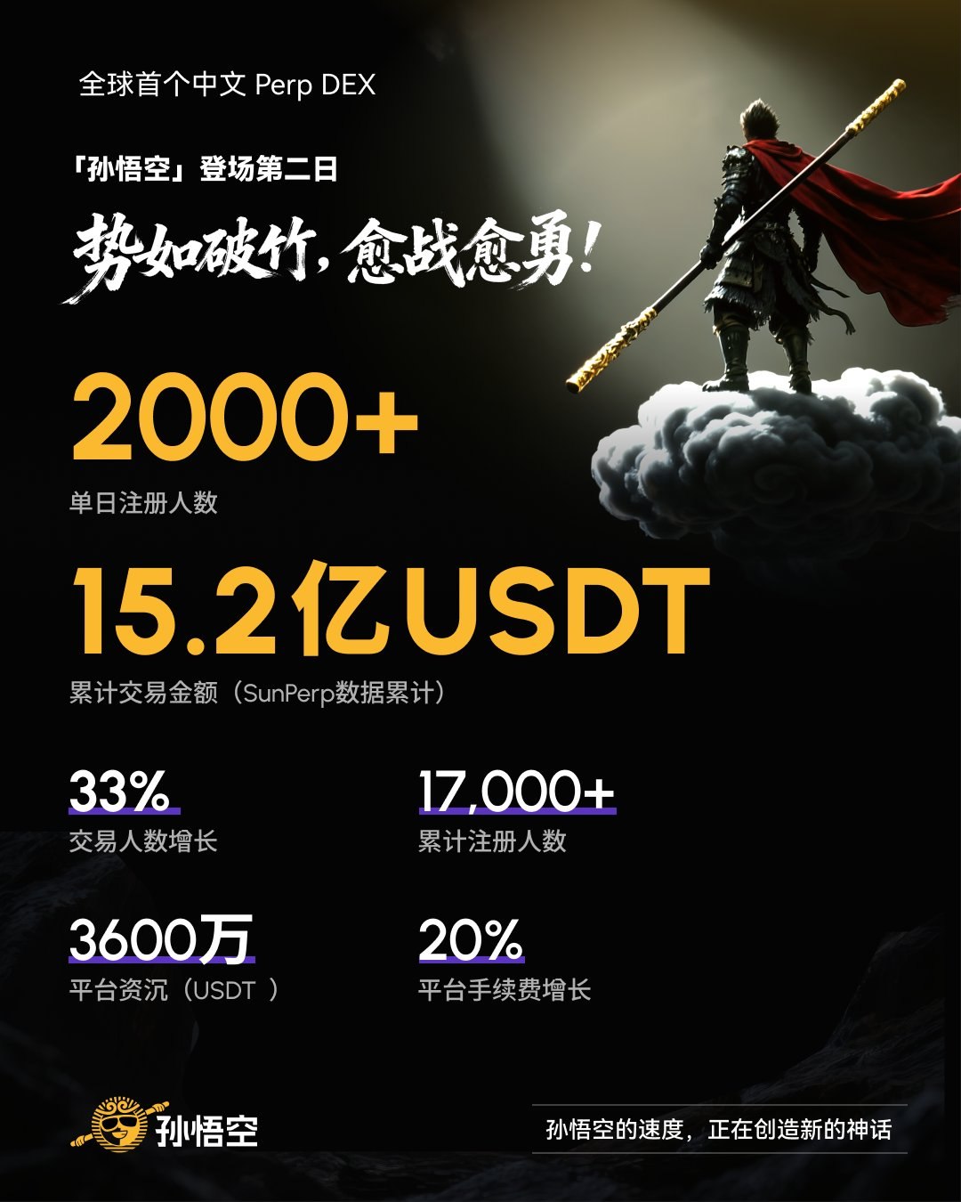 深潮 TechFlow 消息,10 月 11 日,据官方社媒消息,全球首个中文去中心化合约交易所孙悟空正式上线第二天(10月10日),单日新增用户超过2,000人,再创新高。目前平台累计用户数(与SunPerp数据累计)超17,000人,累计交易额达15.2亿USDT。此外平台宣布,针对用户反馈痛点,已于10月10日完成三项体验优化,包括:1. 授权与充值按钮合并;2. 充值USDT顺序靠前;...