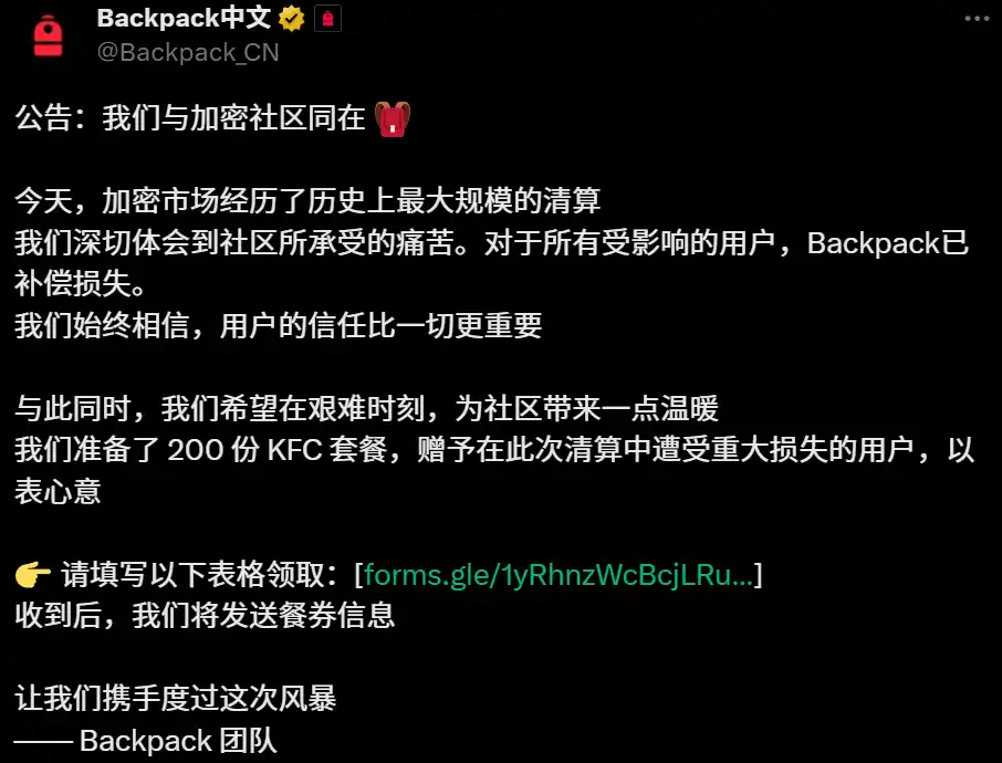 ChainCatcher 消息,10 月 11 日,Backpack 官方宣布, 已向今日市场闪崩期间受影响的平台用户补偿损失,Backpack 重申用户的信任比一切更重要。此外,向此次清算中遭受重大损失的用户赠予 200 份 KFC 套餐,可通过填写官方表单领取。