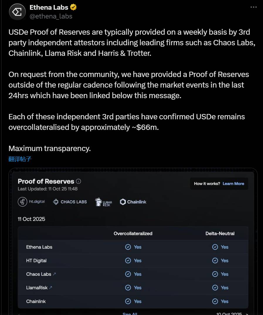 这些独立的第三方均已确认 USDe 仍存在约 6600 万美元的超额抵押。”