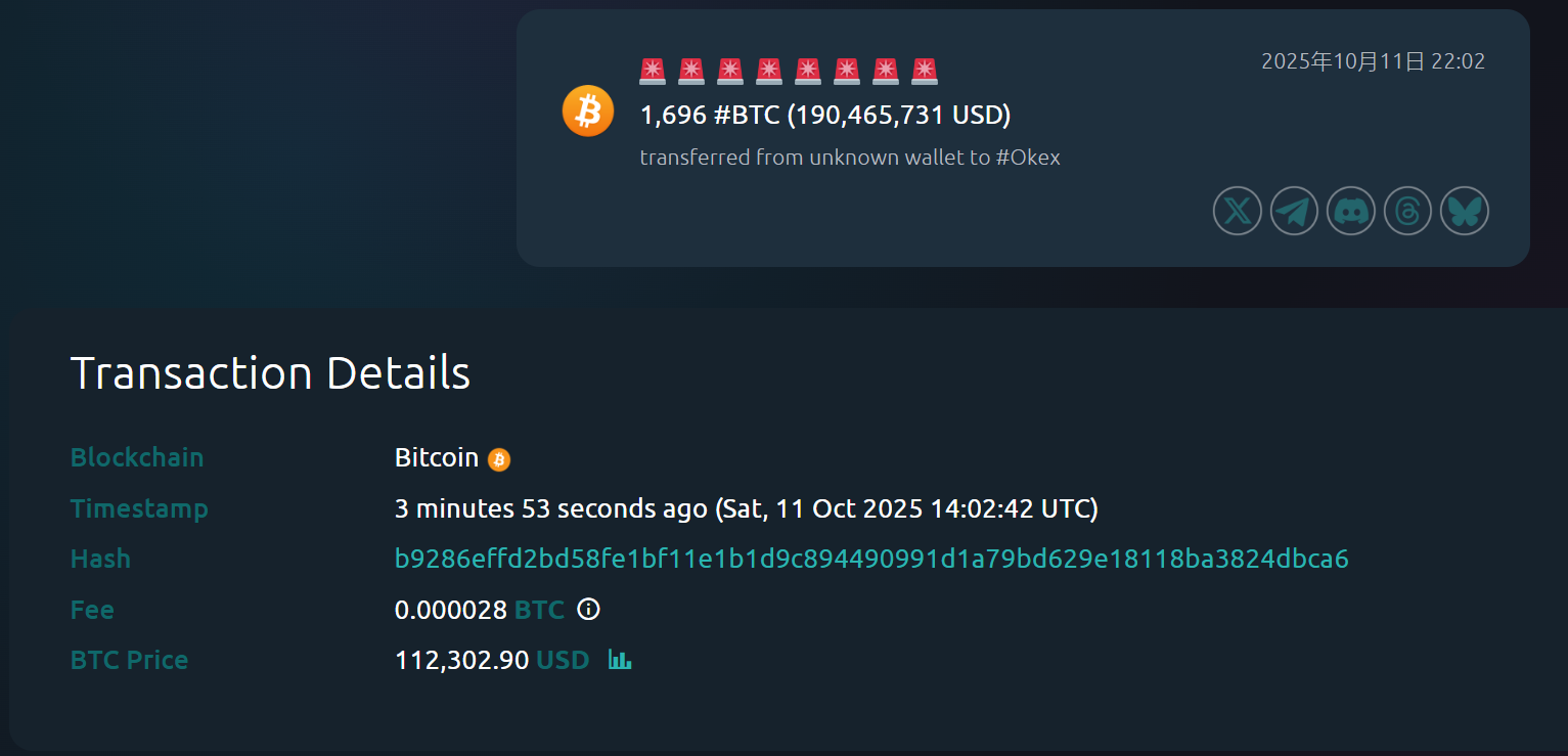 深潮 TechFlow 消息,10 月 11 日,据 Whale Alert 监测,某鲸鱼将 1,696 枚 BTC(价值约 1.9 亿美元)转入 OKX 交易所。