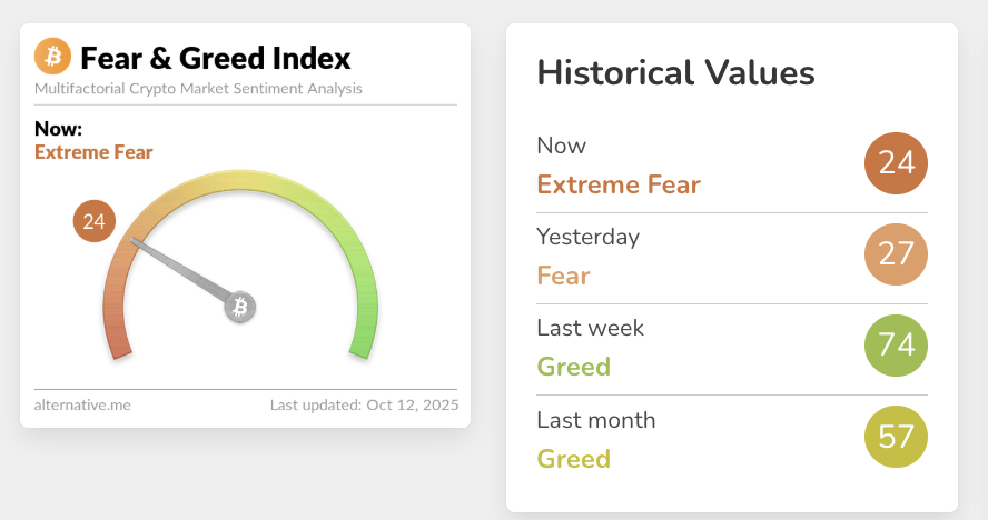 深潮 TechFlow 消息,10 月 12 日,据 Alternative.me 数据,今日恐慌与贪婪指数续降至 24(昨日该指数为 27),市场从「 恐慌状态」转变至「极度恐慌状态」。