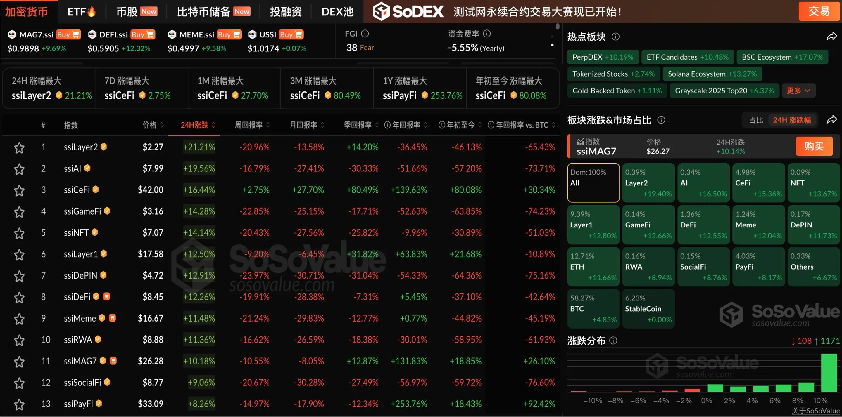 值得一提的是,MAG7.ssi 上涨9.69%,DEFI.ssi 上涨12.32%,MEME.ssi 上涨9.58%。