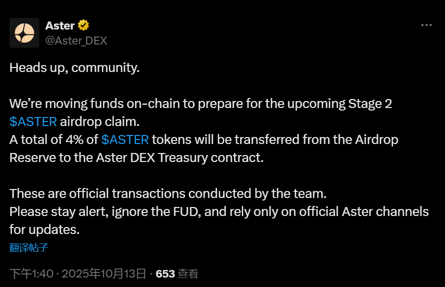 Aster:正在将 4% ASTER 代币转移至国库合约中,为第二阶段空投做准备