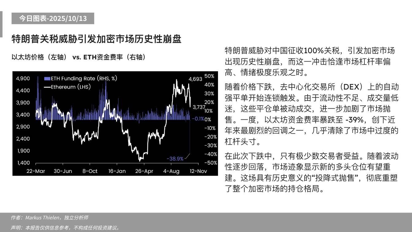 深潮 TechFlow 消息,10 月 13 日,Matrixport 发布今日图表称,“特朗普威胁对中国征收100%关税,引发加密市场出现历史性崩盘,而这一冲击恰逢市场杠杆率偏高、情绪极度乐观之时。随着价格下跌,去中心化交易所(DEX)上的自动强平单开始连锁触发。由于流动性不足、成交量低迷,这些平仓单被动成交,进一步加剧了市场抛售。一度,以太坊资金费率暴跌至-39%,创下近年来最剧烈的回调之...