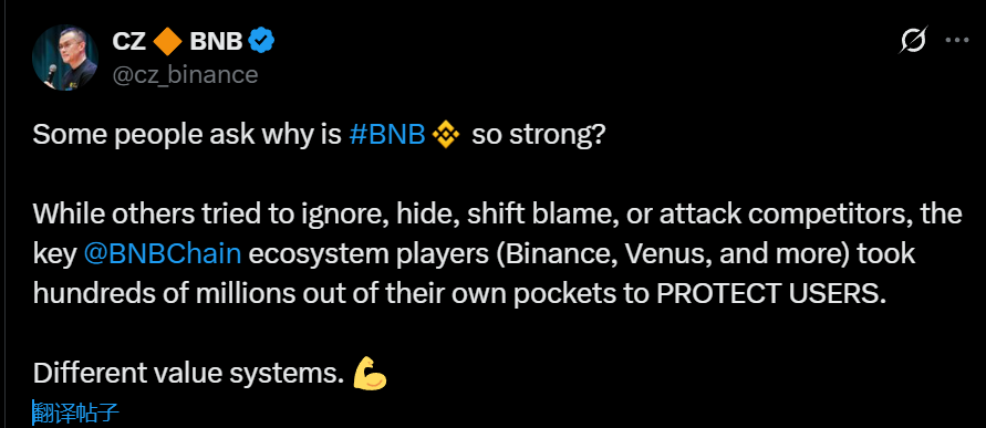 深潮 TechFlow 消息,10 月 13 日,币安创始人 CZ 在 X 平台发文表示,当其他人选择忽视、隐藏、推卸责任或攻击竞争对手时,关键的 BSC 生态参与者曾自掏腰包数亿美元以保护用户,体现出“不同的价值体系”。