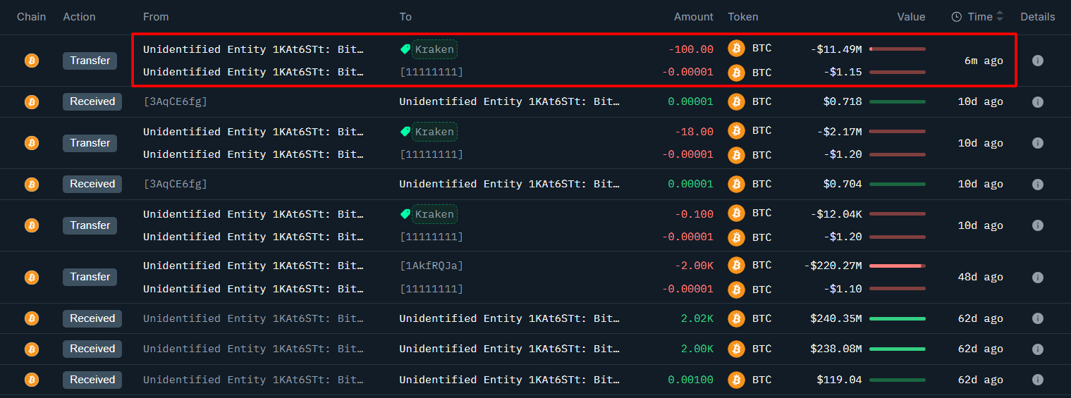 深潮 TechFlow 消息,10 月 13 日,据链上分析师 Onchain Lens(@OnchainLens)监测,一位比特币早期持有者在近期抛售中获利超过 1.85 亿美元后,再次向 Kraken 交易所转入 100 枚 BTC,价值 1149 万美元,疑似准备出售。