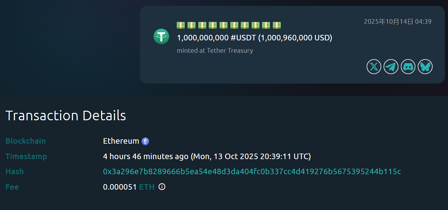 Tether Treasury 今日凌晨在以太坊新增铸造 10 亿枚 USDT