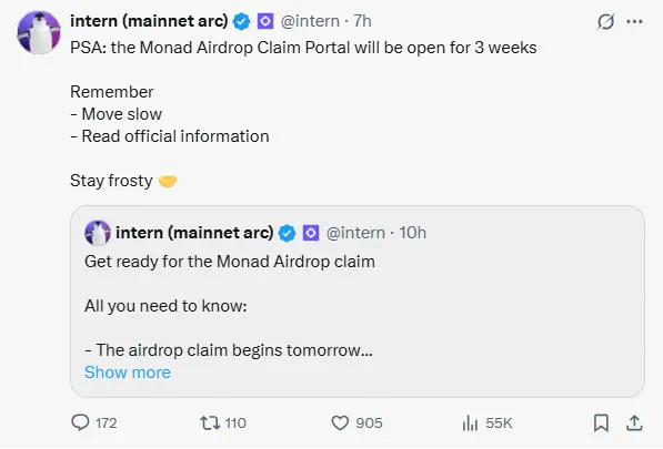 ChainCatcher 消息,Monad 增长主管 Kevin McCordic(@Intern)发文表示,空投申领门户将于北京时间明日 21:00 开启,并将开放 3 周。McCordic 同时提醒用户注意提防假冒空投链接,关注官方信息,并将发布一篇博客,更详细地讨论空投事宜。McCordic 近日在参加播客节目时表示:过去的空投项目通常使用检查系统来判断用户是否符合资格,然后才能领取。M...