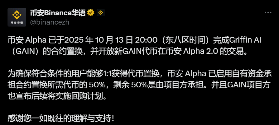 深潮 TechFlow 消息,10 月 14 日,据官方公告,币安 Alpha 已于2025 年 10 月 13 日 20:00(东八区时间)完成Griffin AI(GAIN)的合约置换,并开放新GAIN代币在币安 Alpha 2.0 的交易。为确保符合条件的用户能够1:1获得代币置换,币安 Alpha 已启用自有资金承担合约置换所需代币的 50%,剩余 50%是由项目方承担。并且GAIN项...