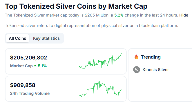 深潮 TechFlow 消息,10 月 14 日,据Coingecko最新数据显示,随着现货白银突破53美元/盎司,代币化白银板块市值已突破2亿美元,现报205,206,802美元,创历史新高,24小时涨幅5.1%。(注:代币化白银是指区块链平台上实物白银的数字化表示)
