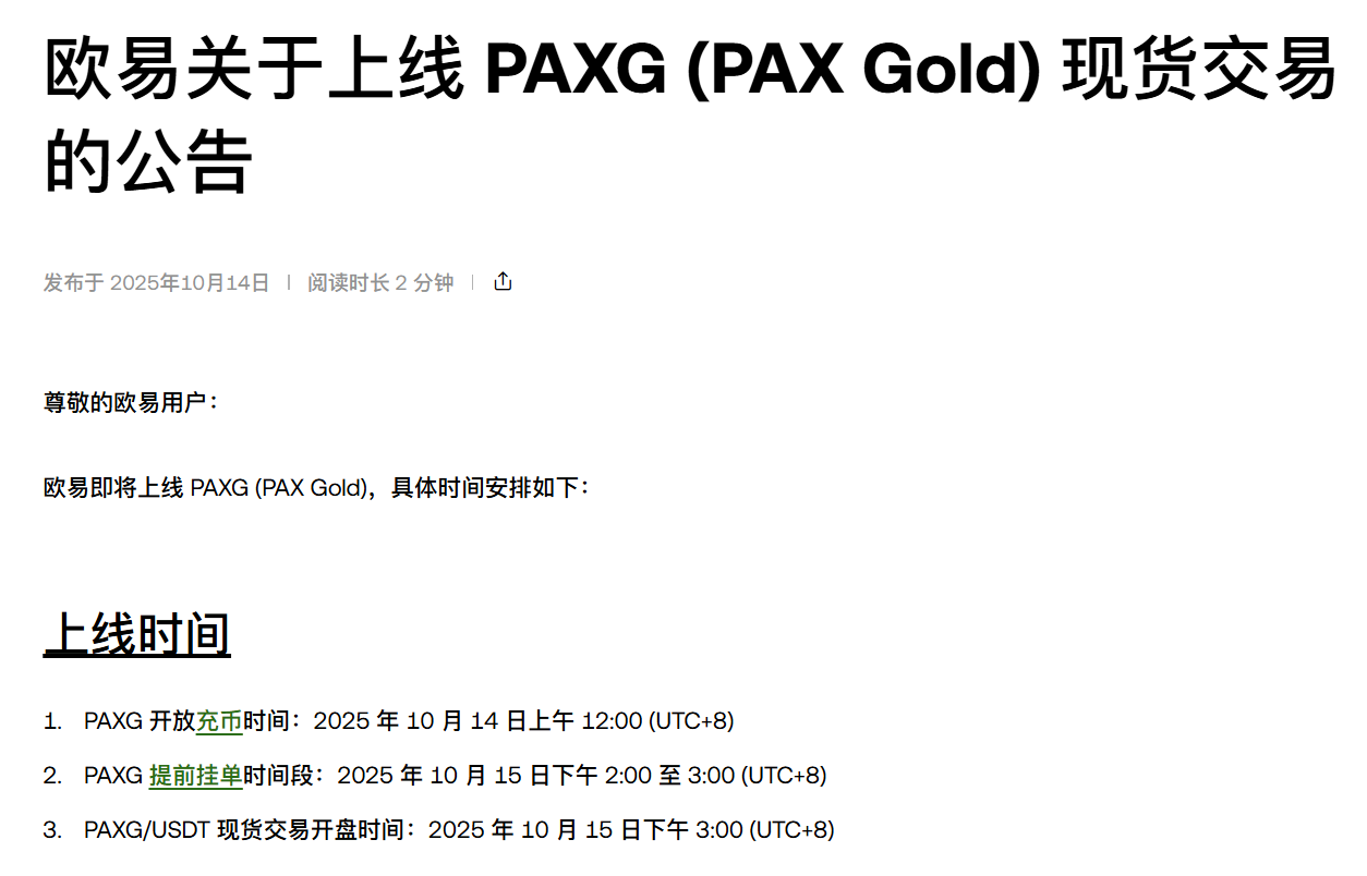 深潮 TechFlow 消息,10 月 14 日,据官方公告,OKX 将上线 PAXG (PAX Gold),具体时间安排如下: