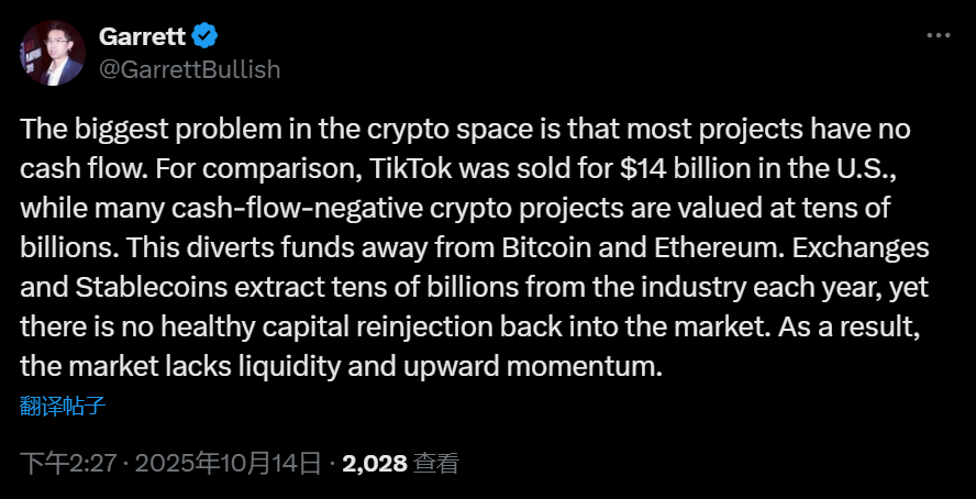 深潮 TechFlow 消息,10 月 14 日,Garrett Jin 在社交媒体发文表示,“加密货币领域最大的问题是大多数项目缺乏现金流。相比之下,TikTok 在美国以 140 亿美元的价格被出售,而许多现金流为负的加密货币项目估值却高达数百亿美元。这导致资金从比特币和以太坊流出。交易所和稳定币每年从该行业攫取数百亿美元,但却没有健康的资本回流市场。因此,市场缺乏流动性和上涨动力。”