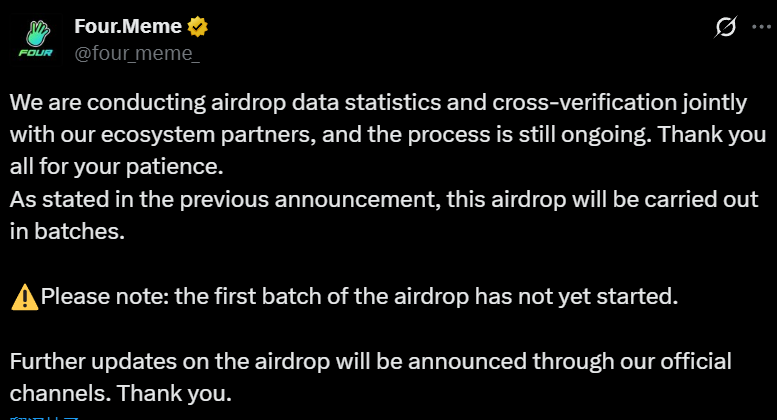深潮 TechFlow 消息,10 月 14 日,据官方公告,Four.meme 官方在社交媒体上发文表示,“我们正在与生态合作伙伴共同进行空投数据统计与交叉核验,相关工作仍在进行中。本次空投将分批进行。第一批空投尚未开始。后续空投进展将通过官方渠道公布。”