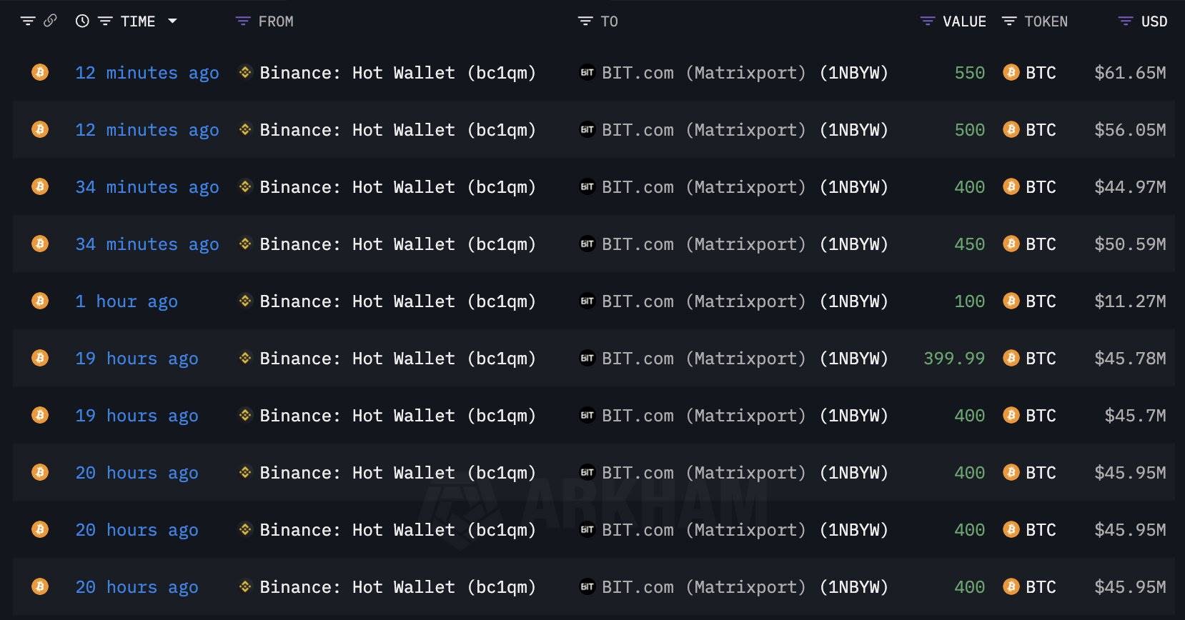 导航:首页>> 快讯>> Matrixport 相关钱包过去 20 小时从币安提取 4,000 枚 BTC,价值约 4.54 亿美元