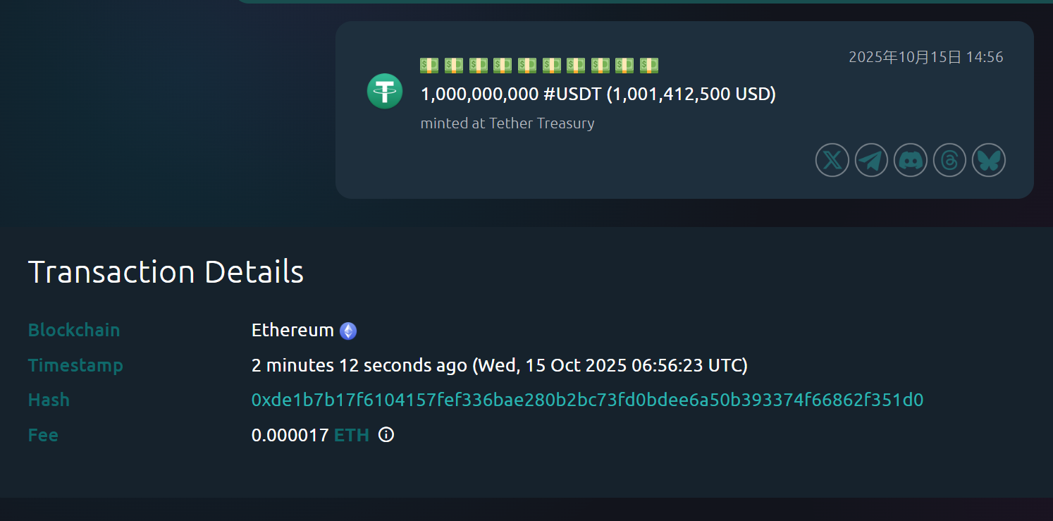 深潮 TechFlow 消息,10 月 15 日,据 Whale Alert 监测,Tether Treasury 约 3 分钟前在以太坊链上新增铸造 10 亿枚 USDT。