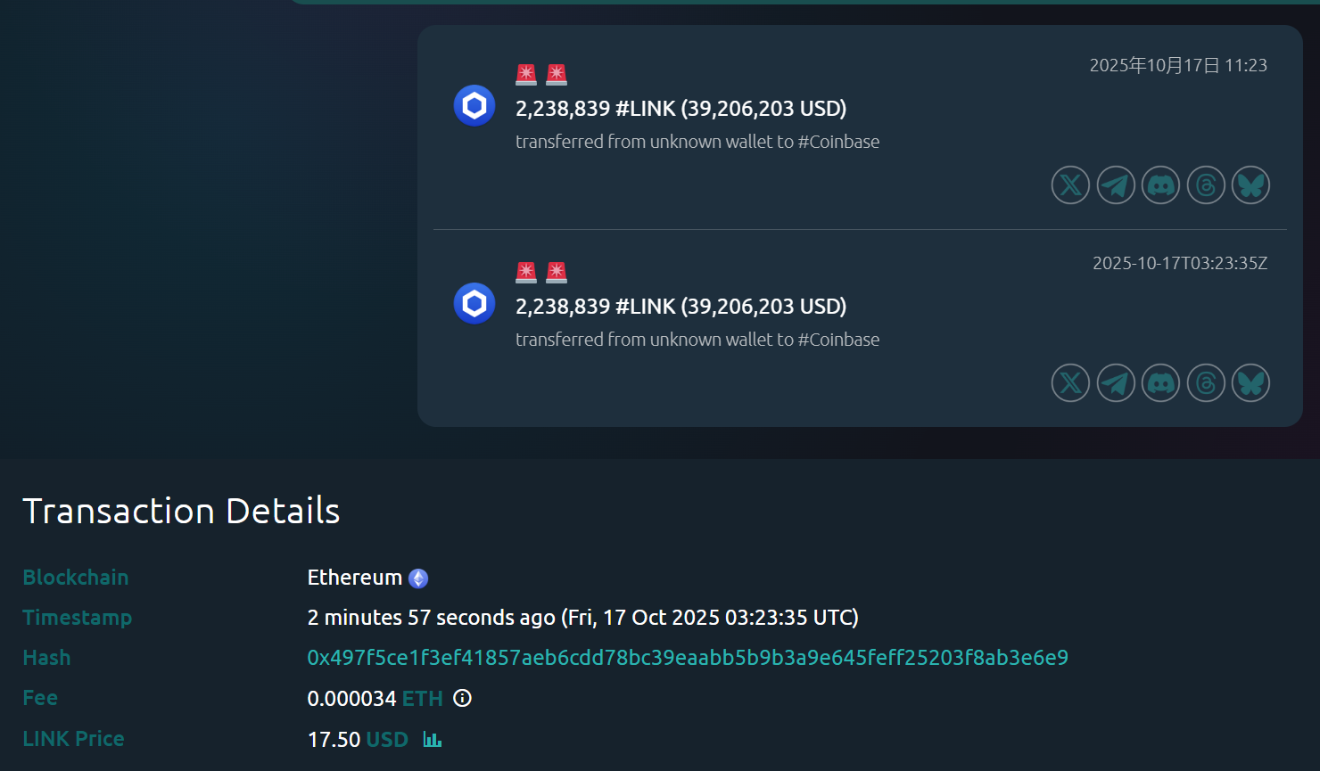 深潮 TechFlow 消息,10 月 17 日,据 Whale Alert 监测,某鲸鱼约 3 分钟前向 Coinbase 转入 2,238,839 枚 LINK 代币,价值约 39,206,203 美元。