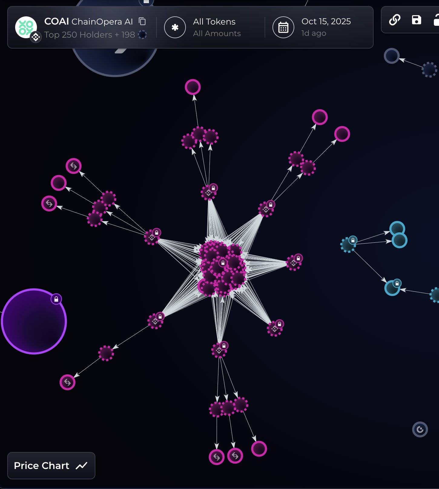 深潮 TechFlow 消息,10 月 17 日,据区块链分析平台 Bubblemaps 监测,单一实体控制了 ChainOpera 代币 COAI 前 100 名盈利交易者中超过 50% 的钱包,总获利达 1300 万美元。监测发现,6 个月前有 60 个钱包表现出相似行为模式:均从币安获得 1 BNB 资金,并在币安 Alpha 平台进行数千笔自动化交易,这 60 个钱包位列最盈利钱包之列...