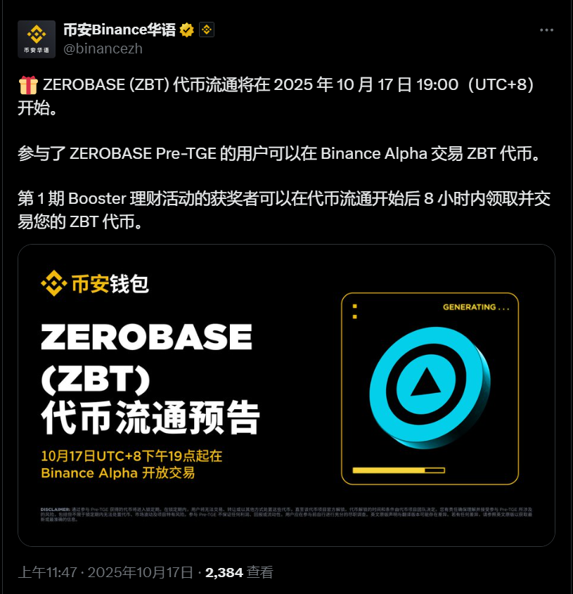 深潮 TechFlow 消息,10 月 17 日,据官方公告, ZEROBASE (ZBT) 代币流通将在 2025 年 10 月 17 日 19:00(UTC+8)开始。参与了 ZEROBASE Pre-TGE 的用户可以在 Binance Alpha 交易 ZBT 代币。第 1 期 Booster 理财活动的获奖者可以在代币流通开始后 8 小时内领取并交易您的 ZBT 代币。 ...