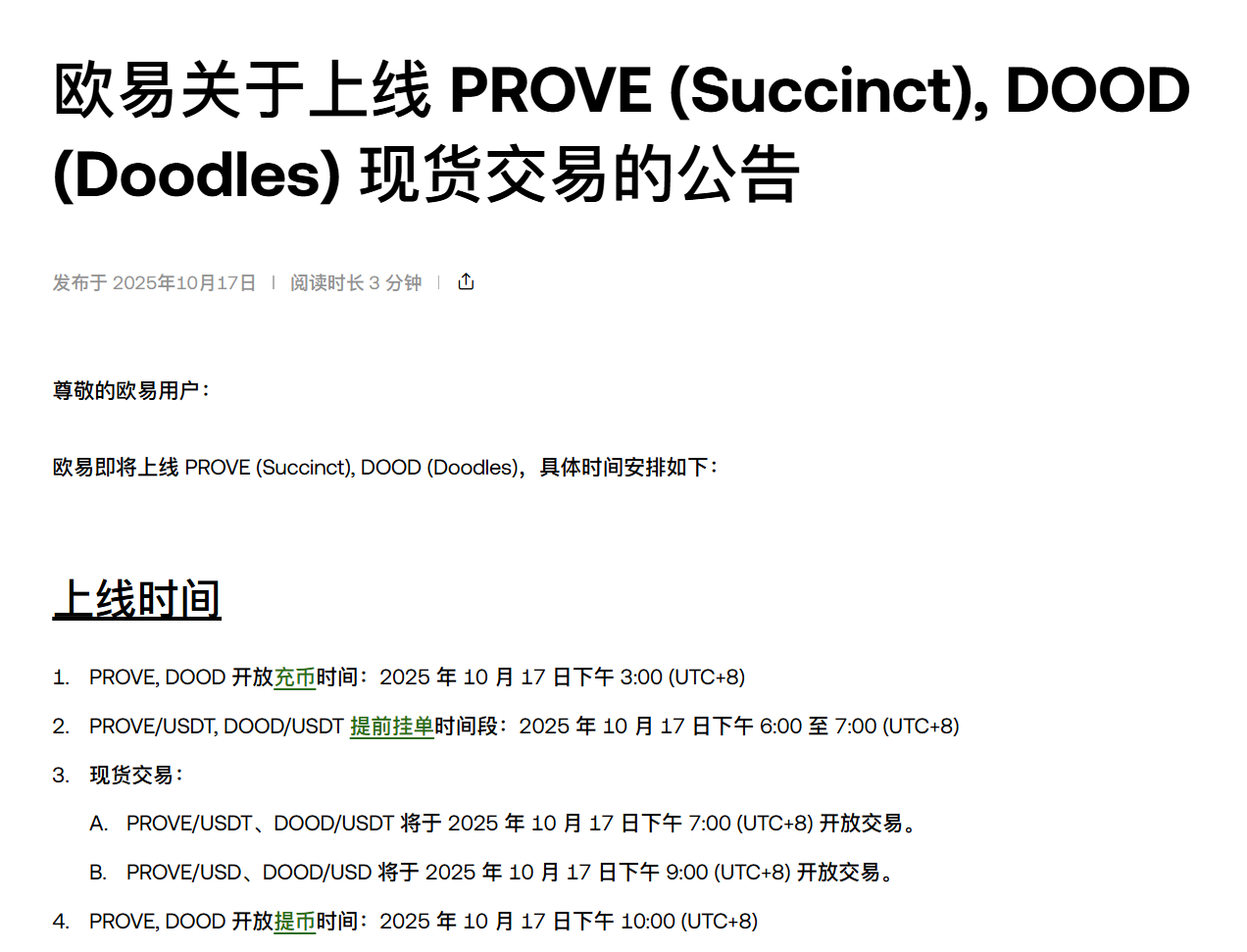 PROVE, DOOD 开放充币时间:2025 年 10 月 17 日下午 3:00 (UTC+8)