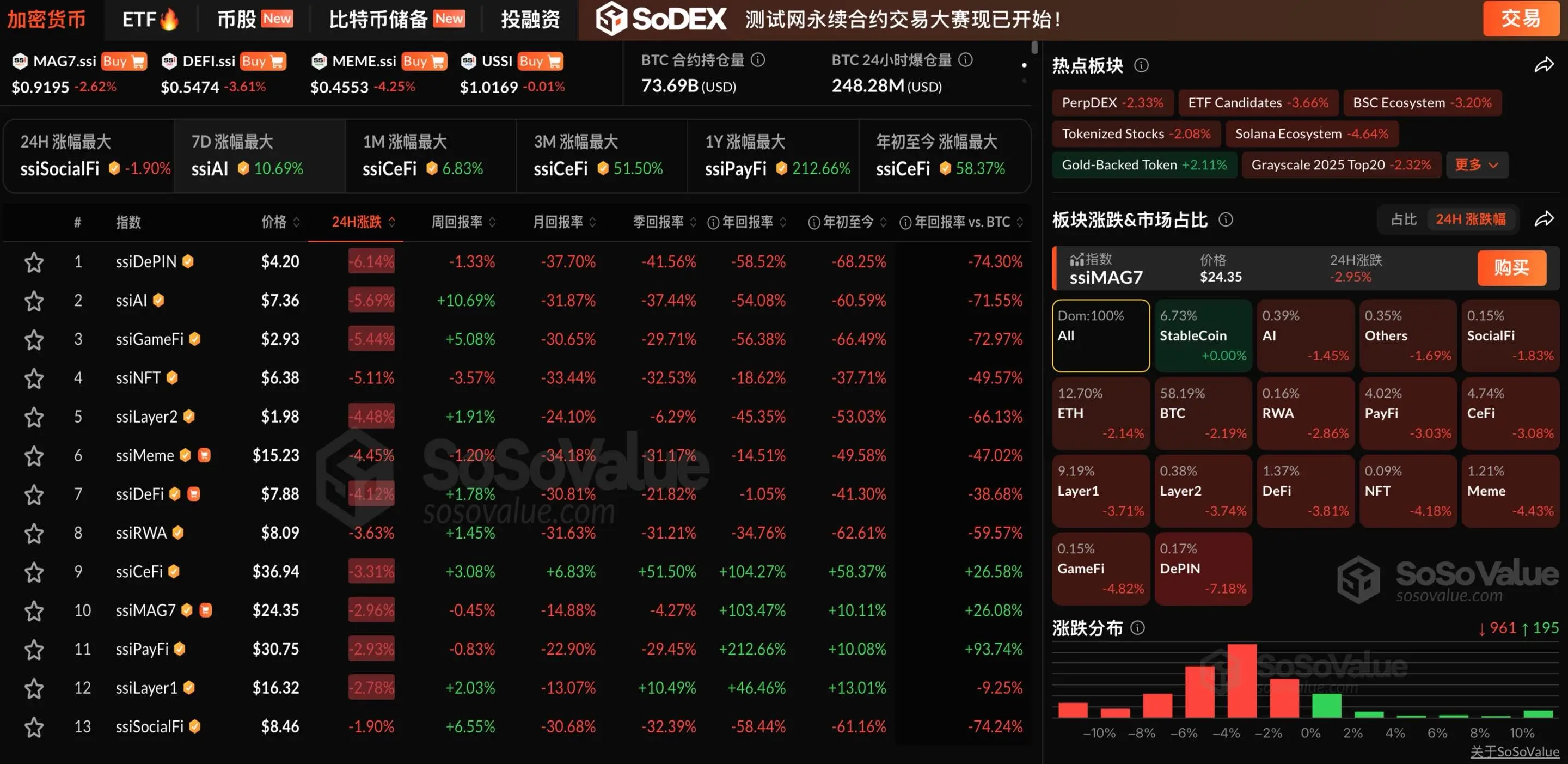 反映板块历史行情的加密板块指数显示,ssiDePIN、ssiAI、ssiGameFi 指数分别下跌 6.14%、5.69%、5.44%。