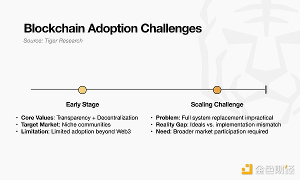 在早期阶段,早期采用者围绕透明度和去中心化开发服务。但采用仅限于小众社群。随着更广泛的参与变得必要,完全用区块链基础设施取代现有系统显然是不切实际的。