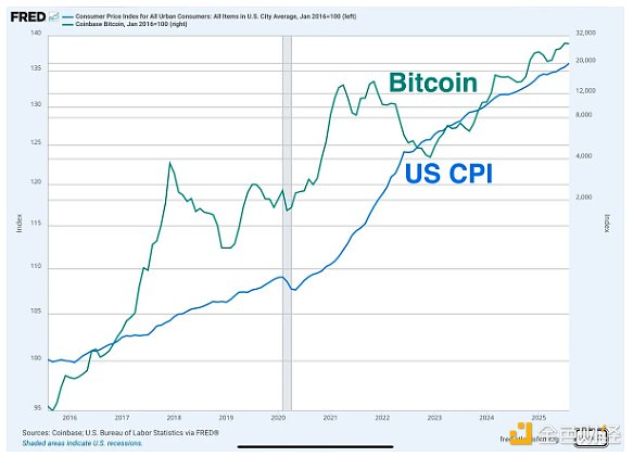 尽管比特币在2023年之前一直追踪CPI走势,但图表上的数据看起来存在很多噪音。但从2023年左右开始,比特币和CPI就紧密联系在一起了。这种紧密的相关性表明,投资者正在将比特币用作通胀对冲资产。