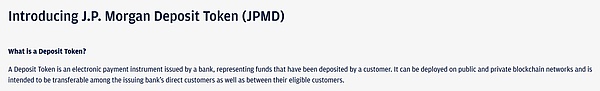 JP Morgan 相信,存款代币将成为数字资产生态系统中一种被广泛使用的货币形式,正如当今商业银行货币(以银行存款的形式)占流通货币的 90%以上。其代币形态将受益于已支持商业银行存款的传统银行基础设施和监管保障。