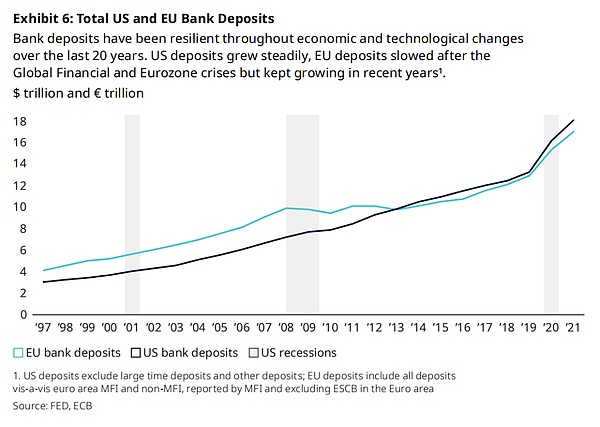 在过去 20 年的经济与技术变迁中,银行存款表现出韧性。美国存款持续增长;欧盟存款在全球金融危机与欧元区危机后增速放缓,但近年来仍保持增长趋势。下图为美国与欧盟银行存款总额