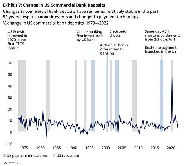 上图为美国商业银行存款变动。近 50 年来,尽管经历经济事件与支付技术变革,美国商业银行存款的变动幅度仍保持相对稳定。