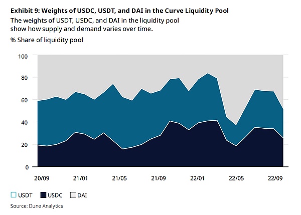 稳定币也面临类似的可持续性问题。其市场表现反映了其信用风险以及供需动态。例如,在以太坊上的 Curve 协议——一个流行的稳定币兑换协议中,某个流动性池包含不同数量的 USDC、USDT 和 DAI。这些稳定币在池中的不均衡权重反映了供需差异,这种差异由多种因素驱动,包括各稳定币在其他 DeFi 协议中的受欢迎程度、市场对其风险的感知等。例如,当用户将某种稳定币兑换为他们认为更安全的另一种稳定币时,前者在池中的比例就会上升。尽管如此,像 Curve 这样的大型流动性池仍使用户能够轻松地在稳定币之间进行兑换,从而通过市场汇率实现稳定币之间的可替代性。举例来说,2022 年 10 月,该 USDC/USDT/DAI Curve 池中的资产总额超过 7.6 亿美元,日交易量达 6000 万美元。