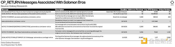 两个页面均声明所罗门兄弟公司客户已向一系列疑似"废弃"的比特币钱包地址发送通知,建议钱包所有者联系所罗门兄弟公司和/或通过签名交易进行密码学所有权验证。通知警告若地址所有者未在指定截止日前回应,其地址将被视为废弃状态,客户可能采取包括通过"推定占有"主张相关币种所有权在内的救济措施。需重点关注的是,两份通知虽名称不同(分别标注为"法律通知"与"所有者通知")且截止日各异(所有者通知截止日为10月10日,法律通知截止日为11月5日),但内容措辞完全一致。此次行动使用多链接及不同通知标题,很可能是为跟踪消息接收者90天响应窗口(因通知发送时间跨度达一个月)。