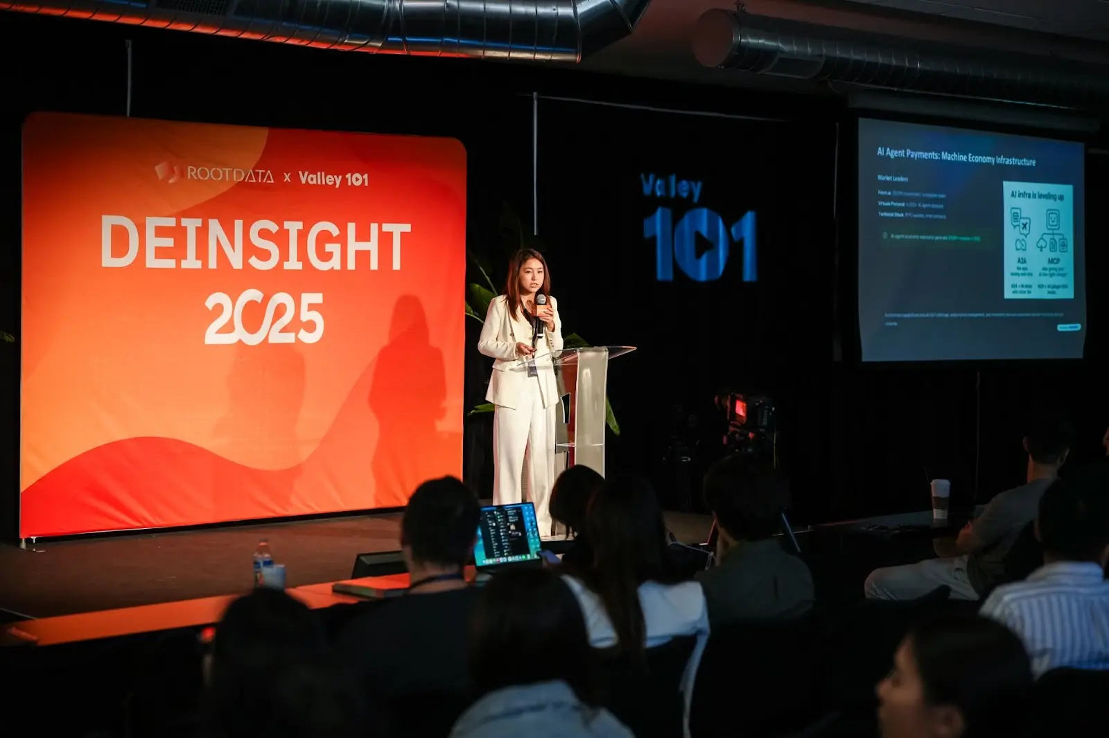 硅谷时间 10 月 5 日,硅谷101 x RootData 年度峰会在硅谷圆满落幕。本届峰会由硅谷101 与 RootData共同主办,并设置《Valley 101 Alignment 2025 Tech Summit》、《DeInsight 2025》两大论坛,其中《DeInsight 2025》论坛由 AWS 和 ChainOpera AI 联合赞助,区块链媒体 ChainCatcher、代理加密浏览器 Donut 以及 Al+Web3 投资加速器 AI101Labs 联合举办。