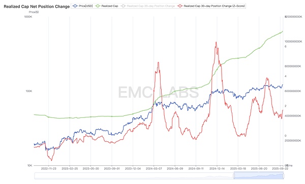 伴随BTC Spot ETF和DATs公司的大规模介入,BTC迎来一个大换手时代。大量BTC正从早期持有者转入BTC Spot ETF和DATs公司的托管账户。这使得早期Crypto持有者惯常使用的中心化交易所持有的BTC在本阶段开始大幅下滑。截止2025年9月底,超过40万枚BTC流出了中心化交易所的管理地址,以10万美元计,价值超过400亿美元。