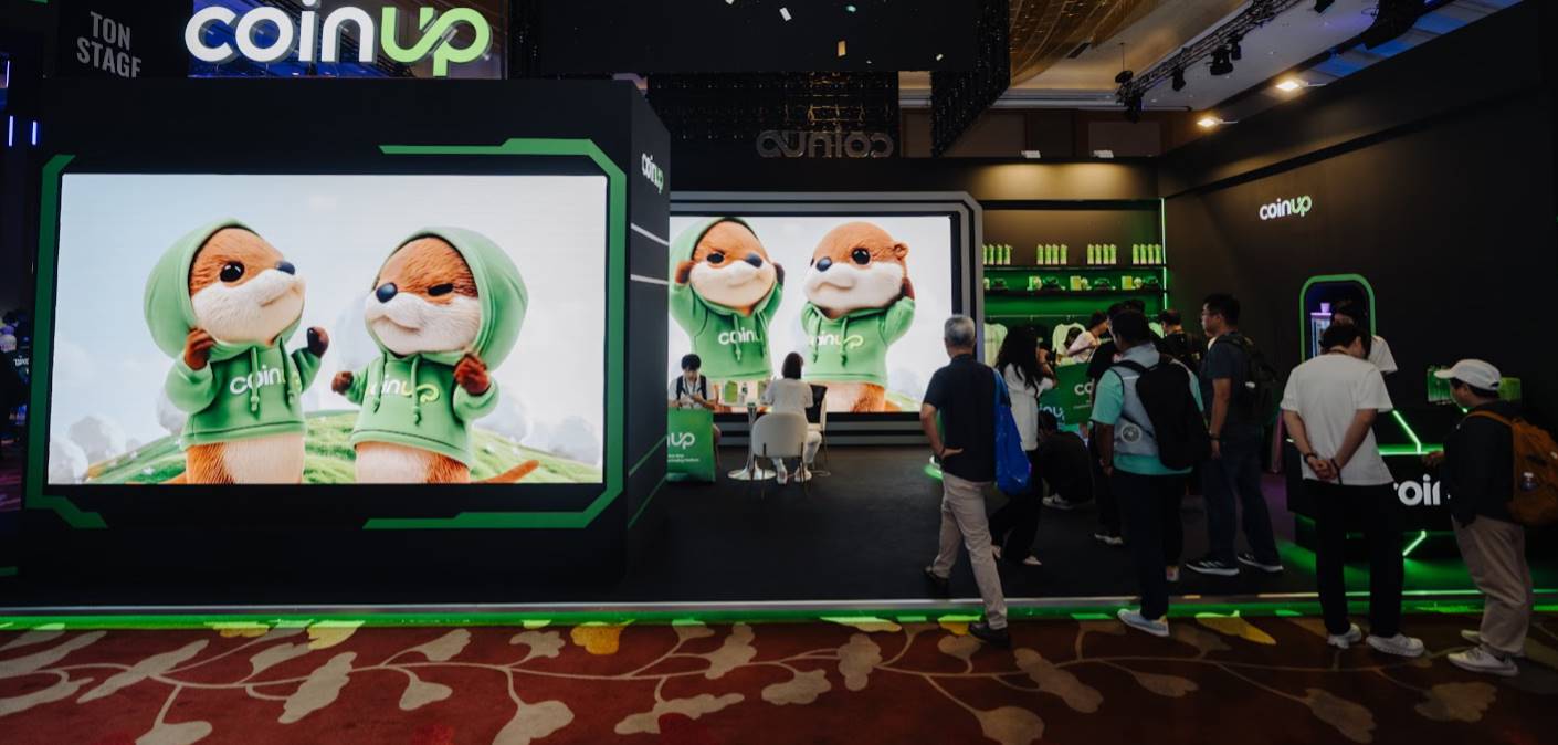 在TOKEN2049会场5楼中心,CoinUp展位化身"加密绿洲"的视觉焦点,清新绿调与自然元素交织,营造出安全与亲切的沉浸式体验。新LOGO以极简线条传递秩序与力量,绿色基调象征希望与生机,诠释"安全、专业、温暖"的品牌哲学。