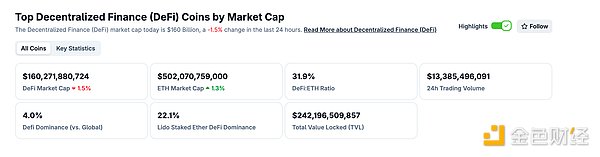 DeFi数据1.DeFi代币总市值:1602.71亿美元DeFi总市值 数据来源:coingecko2.过去24小时去中心化交易所的交易量133.85美元过去24小时去中心化交易所的交易量 数据来源:coingecko3.DeFi中锁定资产:1558.76亿美...