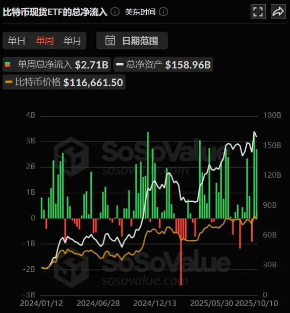 上周,美国比特币现货 ETF 四日净流入,总净流入 27.1 亿美元,总资产净值达 1589.6 亿美元。
