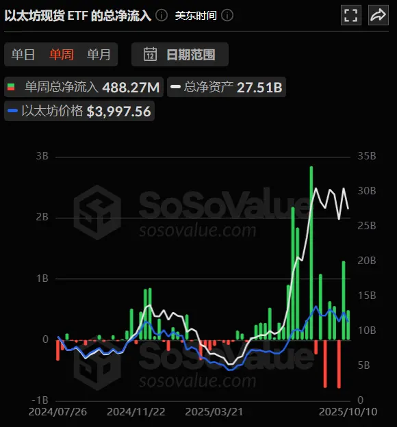 上周,美国以太坊现货 ETF 三日净流入,总净流入 4.88 亿美元,总资产净值达 275.1 亿美元。