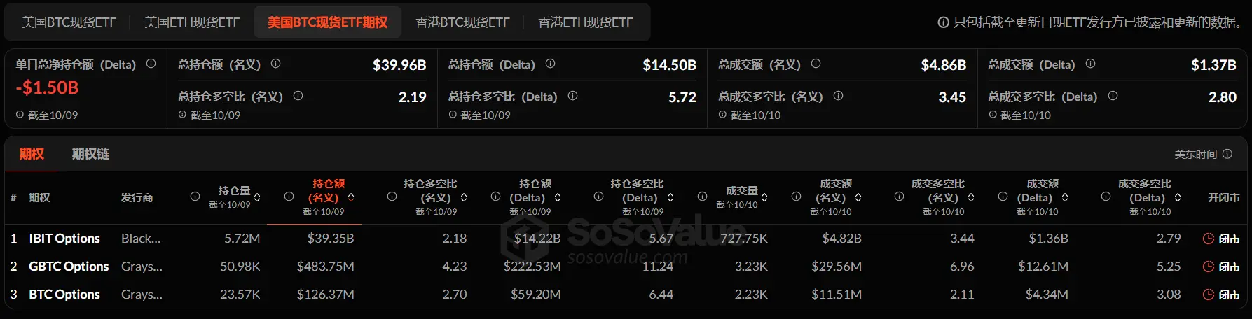 截至 10 月 10 日,美国比特币现货 ETF 期权名义总成交额为 48.6 亿美元,名义总成交多空比为 3.45。