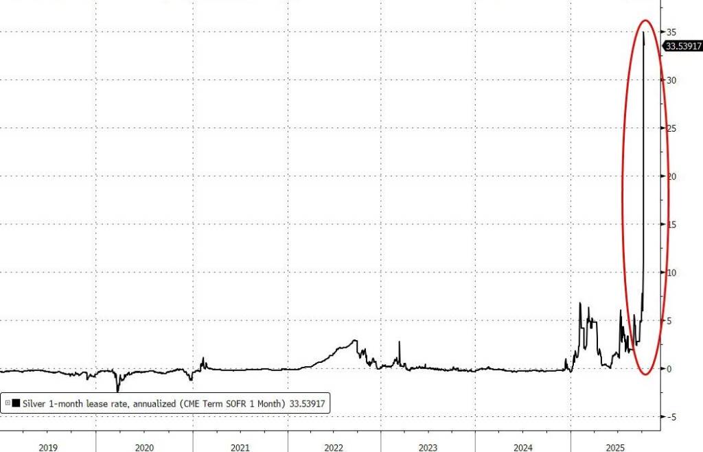 伦敦白银市场的流动性几乎完全枯竭,持有空头头寸的交易商正面临巨大压力。由于难以在市场上找到可供交割的实物白银,他们被迫支付高昂的展期成本。数据显示,伦敦白银的一个月租赁利率(即借入白银的成本)已飙升至30%以上,而隔夜借贷成本的年化利率甚至一度超过100%。