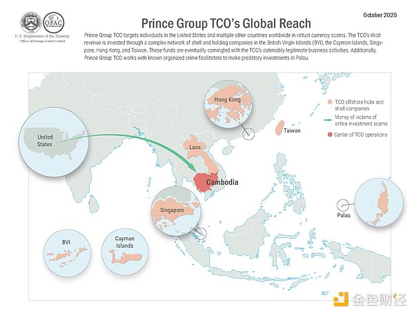 美国财政部外国资产控制办公室(OFAC)和金融犯罪执法网络(FinCEN)与英国外交、联邦和发展办公室(FCDO)密切协调,已对跨国诈骗犯罪组织“太子集团”(Prince Group TCO)的146名成员实施全面制裁。该组织总部位于柬埔寨,由柬埔寨公民陈志(Chen Zhi)领导,通过针对美国及全球其他地区的在线投资诈骗,运营着一个跨国犯罪集团。此外,FinCEN根据《美国爱国者法案》第311条规定,将总部位于柬埔寨的金融服务集团Huione Group从美国金融体系中剔除。多年来,Huione Group一直为恶意网络攻击者洗钱,包括虚拟货币诈骗和盗窃所得。