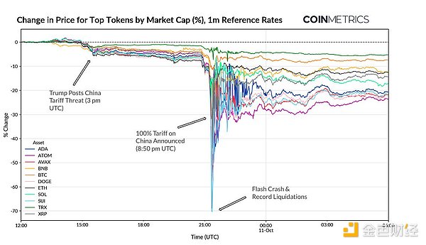 作者:Tanay Ved 来源:Coin Metrics 翻译:善欧巴,金色财经10 月 10 日周五,宏观新闻引发连锁反应,加密货币市场遭遇海啸级动荡,迎来加密史上清算规模最大的一天。从价格错位到杠杆清零,再到流动性枯竭,本文将拆解此次崩盘的全过程,并揭示...