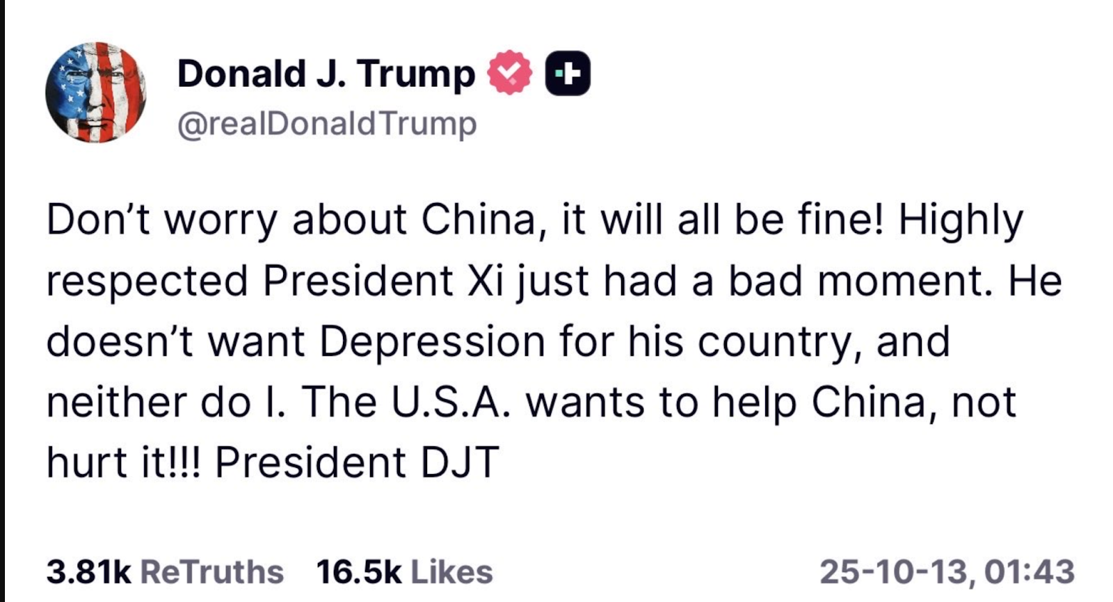 这场风暴的导火索,市场普遍指向美国总统特朗普在社交媒体上发布的一条贴文——声称要对所有中国商品全面加征100%的关税。然而,正如剧本反复上演的那样,在市场极度恐慌之后,特朗普话锋一转,迅速释放出“将与中国和谈”的信号。市场情绪也在暴跌后回暖,比特币收回至11000以上,主流币种普遍反弹超过10%。