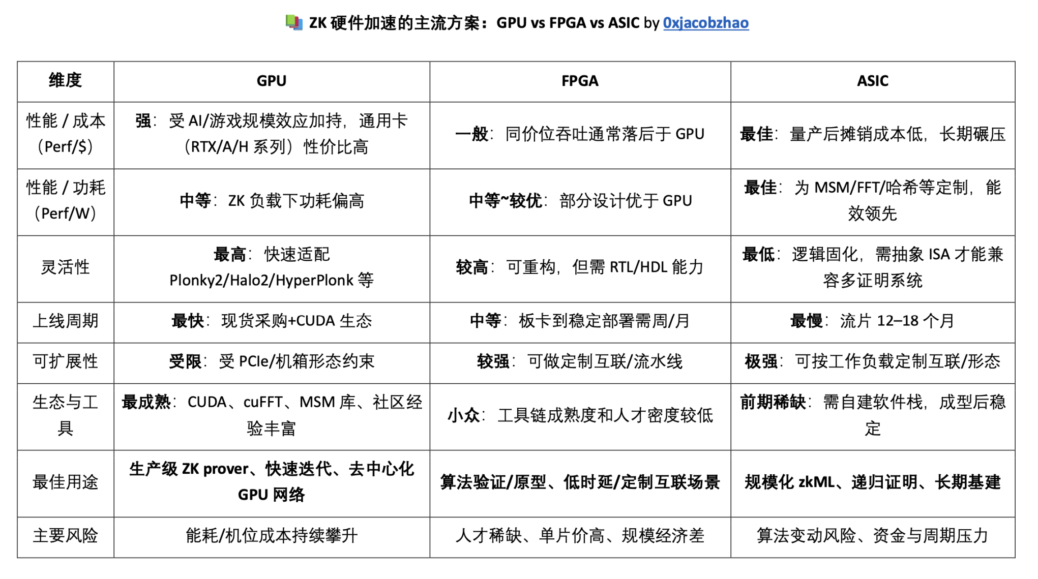 FPGA 灵活方案:Paradigm 在 2022 年曾押注 FPGA,认为其在灵活性、效率与成本之间处于「甜蜜点」。FPGA 的确具备灵活可编程、开发周期短、硬件可复用等优势,适用于 ZK 证明算法迭代、原型验证、低延迟场景(高频交易、5G 基站)、功耗受限的边缘计算与高安全加密等任务。但在性能和规模化经济性上,FPGA 难以与 GPU、ASIC 竞争。其战略定位更接近「算法未定型时的验证与迭代平台」,以及少数细分行业中的长期刚需。