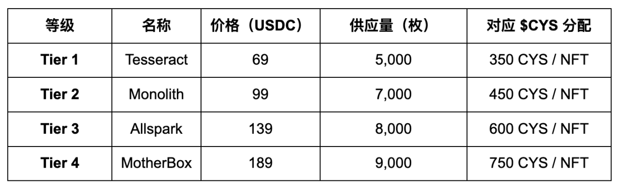 NFT 总量为 29,000 枚,累计分配约 1,645 万 CYS(占总供应 1.65%,在社区分配上限 9% 内)。解锁方式为 50% TGE 即时解锁 + 50% 六个月线性释放。除固定分配外,NFT 持有者还享有 Multiplier 火力加速(最高 1.2x)、优先算力任务权、治理权重等额外权益。目前公开销售已经结束,用户可在 OKX NFT Marketplace 进行交易。