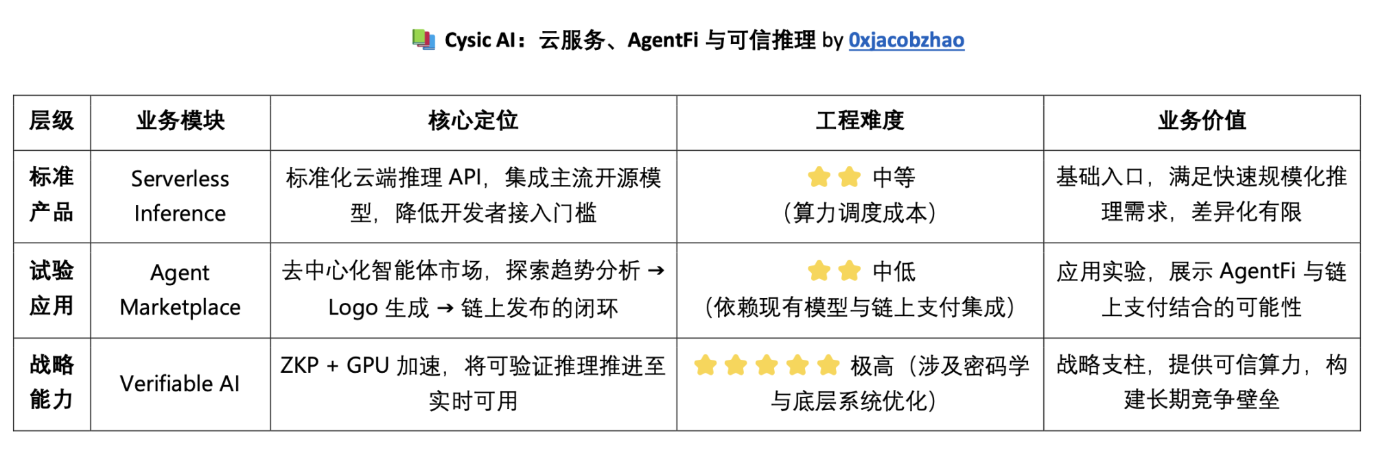 Cysic AI 的业务布局呈现「产品—应用—战略」三层:底层 Serverless Inference 提供标准化推理 API,降低模型调用门槛;中层 Agent Marketplace 探索 AI Agent 的链上闭环应用;顶层 Verifiable AI 以 ZKP+GPU 加速支撑可信推理,承载 ComputeFi 的长期愿景。