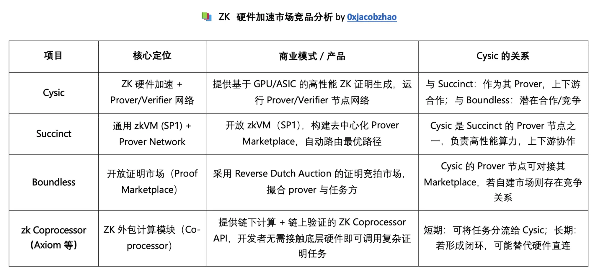 在 ZK Marketplace、Prover Network 与 zk Coprocessor 赛道,Cysic 当前更多扮演 上游算力供应商 的角色,而 Succinct、Boundless、Risc0、Axiom 等项目则通过 zkVM、任务调度和开放市场撮合切入同一客户群(L2、zkRollup、ZKML)。